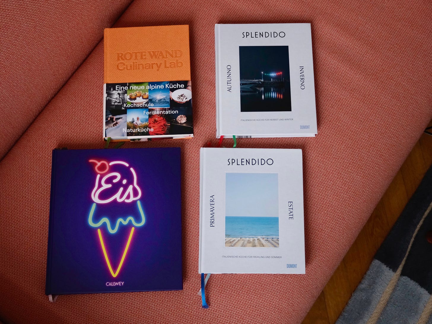 Erstmals gab es 2025 die stark aufgestellte Kategorie Foodfotografie. Knappe Gewinner waren für mich Mercedes Lauenstein und Juri Gottschall, Betreiber des Onlinemagazins Splendido, und ihre beiden Jahreszeitenbücher “Primavera/Estate” und “Autunno/Inverno”. Auf dem zweiten Platz landeten Ingo Pertramers unverkennbare Blitzaufnahmen eines meiner Lieblingshotels in “Rote Wand. Culinary Lab. Eine neue alpine Küche. Kochschule. Fermentation. Naturküche”. Platz drei gebührt dem Neonröhrenreigen in jenem schlicht “Eis” betitelter Klopper, für den ich demnächst mal wieder meine Eismaschine anwerfen werde.